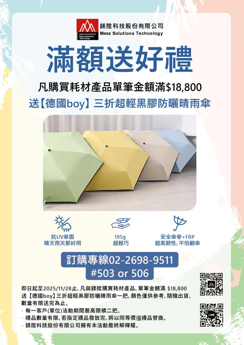 滿額贈禮活動 即日起至2025/11/28止 凡與鎂陞科技購買耗材產品,單筆金額滿$18,800,即贈【 德國boy 】 三折超輕黑膠防曬晴雨傘一把 數量有限要買要快! ..