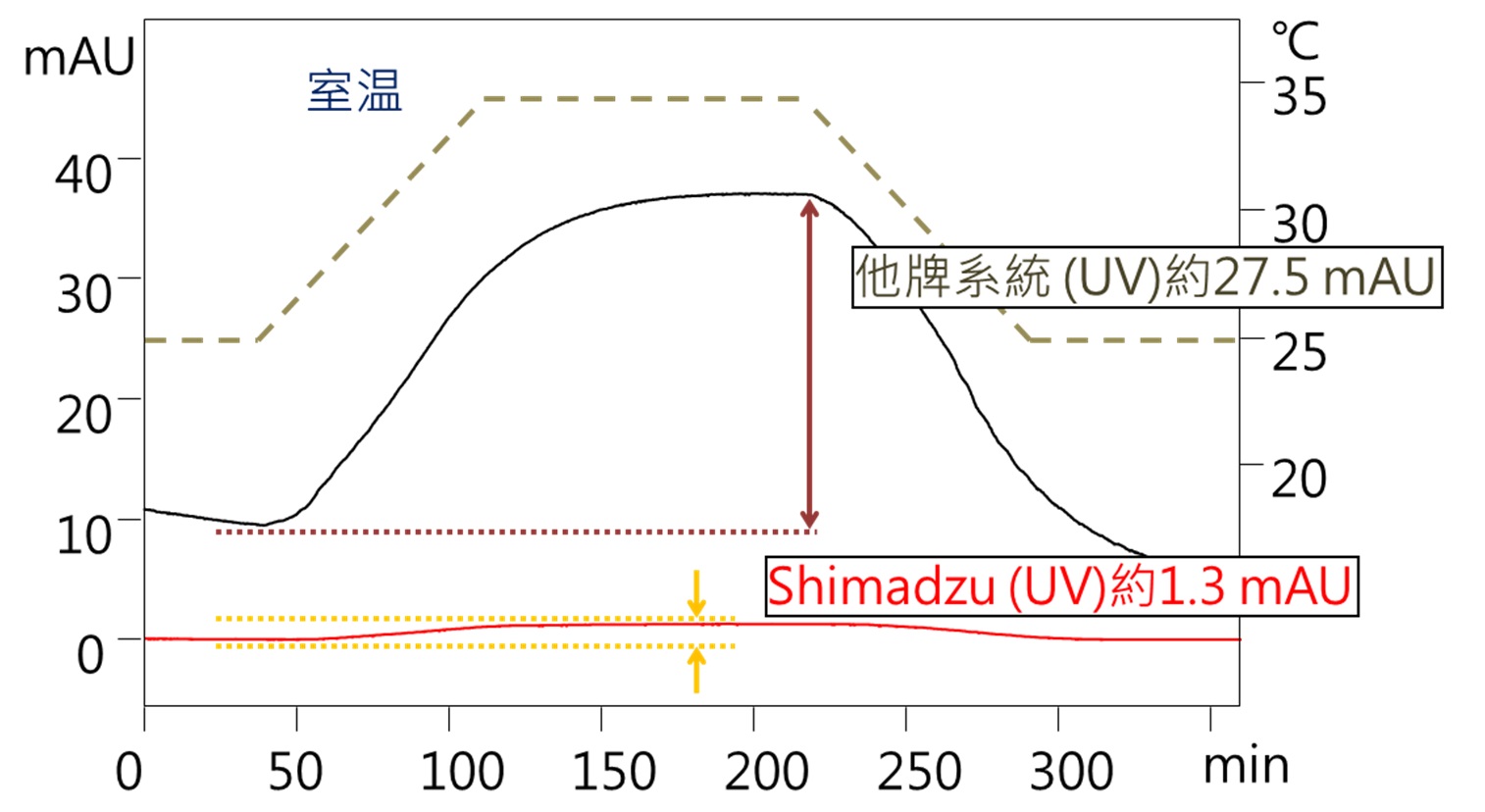 因為溫度的變化會讓光學元件有熱漲冷縮現象,造成層析圖的基線不穩,基線跳動明顯時,可能很難分辨是否為雜訊或是不純物的訊號。