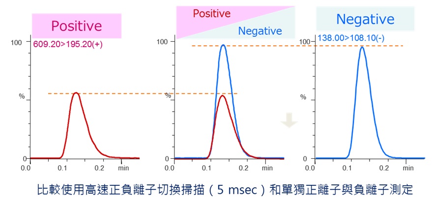 ►LCMS-8045 擁有市面上LC-MS/MS 最快的正負電離子切換,切換速度僅5 msec。在高速的正負離子切換下也不影響訊號強度。