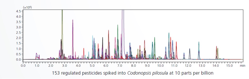 ►即使針對需同時分析多種成分的樣品如農藥與動物用藥等。LCMS-8045 掃描速度迅速搭配超高速的正負離子切換速度,即使同時進行測定MRM與二次離子掃描亦不影響定量精確度。
