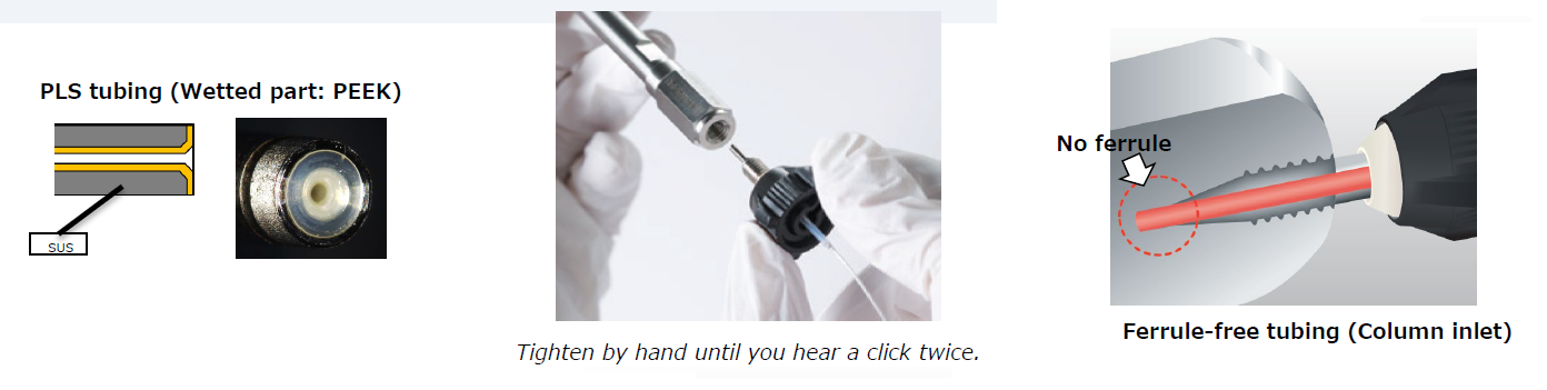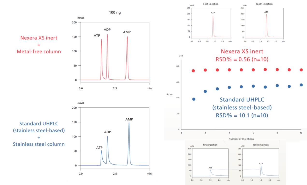 在分析核酸或蛋白質等生物樣品時,往往會需要使用到高鹽類的動相容易對金屬管線造成腐蝕,生物樣品本身又很容易吸附在金屬表面上,以往大多使用PEEK材質的管線來因應,但PEEK管線的缺點就是無法耐到高壓,分析效能相對有限。Nexera XS inert UHPLC system,兼顧金屬和PEEK的優點,既可以耐受到15000psi的高壓又不會有吸附和管線腐蝕的問題,是分析生物樣品的最佳選擇。