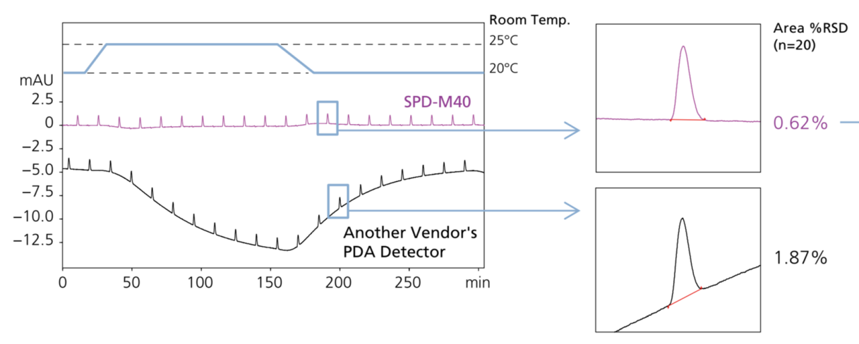 因為溫度的變化會讓光學元件有熱漲冷縮現象,造成層析圖的基線不穩,基線跳動明顯時,可能很難分辨是否為雜訊或是不純物的訊號。