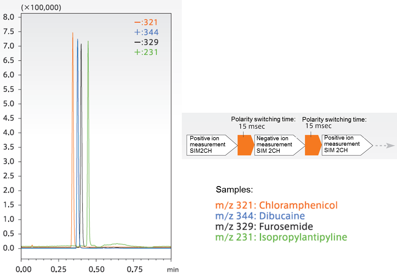 ►為了同時檢測正離子和負離子,在檢測時需正負離子模式間交替切換,LCMS-2020 通過專利的高壓電源技術實現了超高速極性切換。